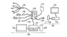 マルチポートモジュール102には、心電ケーブル105、第1観血血圧ケーブル106、第2観血血圧ケーブル107、体温プローブ108、酸素飽和度センサ109およびカフ110が接続されている。心電ケーブル105は、心電図のセンサと呼吸のセンサとの双方を兼ねており、患者体表上の複数箇所に装着された電極により、生体から出力される電気信号を検出して、これを表す検出信号を得る。第1観血血圧ケーブル106は、患者の特定部位の動脈または静脈に挿入されたトランスデューサにより、第1観血血圧値を検出して、これを表す検出信号を得る。第2観血血圧ケーブル107は、患者の、第1観血血圧ケーブル106とは別の部位の動脈または静脈に挿入されたトランスデューサにより、第2観血血圧値を検出して、これを表す検出信号を得る。体温プローブ108は、患者体表上の特定部位に装着され、体温値を検出して、これを表す検出信号を得る。酸素飽和度センサ109は、患者体表上の特定部位に装着され、光吸収率値を検出して、これを表す検出信号を得る。カフ110は、患者体表上の特定部位に装着され、装着部位の非観血血圧値を検出して、これを表す検出信号を得る。なお、以下の説明では、心電ケーブル105、第1観血血圧ケーブル106、第2観血血圧ケーブル107、体温プローブ108、酸素飽和度センサ109およびカフ110のうち、1または2以上のものに言及するとき、「生体情報センサ」という。  The