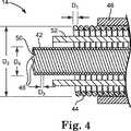 図4は、リード14の、図3の4−4線における断面図である。さらに図4に示すように、また、いくつかの実施形態では、外側導体ワイヤ44は、ワイヤ44の有効ピッチを減少させるために直径の小さなワイヤで形成され、それによりワイヤ44のインダクタンスを増大させる。いくつかの実施形態では、たとえば、外側導体ワイヤ44のワイヤ径D1は、約0.0254〜0.1524mm(0.001〜0.006インチ)の範囲、より具体的には約0.0762〜0.1016mm(0.003〜0.004インチ)の範囲にある。ただし、外側導体ワイヤ44のワイヤ径D1は、用いられるリードのタイプ、リードの構成、ならびに他の要因に応じて、これより大きくても小さくてもよい。外側導体ワイヤ44の直径D1が比較的小さいため、これより大きなワイヤ径を有する従来のリードに比べて、リード14の長さに沿って存在するコイルの巻き数が多く、このため導体ワイヤ44のインピーダンスが増大する。インピーダンスがこのように増大することは、リード電極(複数可)30において又はその近傍において周囲の体組織に消散されるエネルギーを減らすことを支援する。4 is a cross-sectional view of the