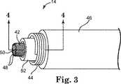さらに図3に示すように、また、いくつかの実施形態では、外側導体ワイヤ44は、内側導体ワイヤ42のまわりに同軸状に配置され、リード14の長さの全部又は一部に沿って延びるらせんコイル構成を有する。いくつかの実施形態では、外側導体ワイヤ44は、巻き付けられた単一のワイヤから形成される単一糸線構造を有する。別の実施形態では、外側導体44は、共に径方向に巻き付けられた複数のワイヤ糸線から形成される多糸線構造を有する。一実施形態では、たとえば、外側導体ワイヤ44は、共に径方向に巻き付けられた2つのワイヤ糸線から形成される二重糸線構造を有する。  As further shown in FIG. 3, and in some embodiments, the