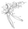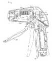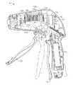 動作の際、器具10の操作者が、発射トリガー20をピストルグリップ26に向かって引くと、モータ駆動センサ110がその動きを検出して信号を送り、モータ65に電力が供給され、螺旋歯車ドラム80が回転する。螺旋歯車ドラム80が回転すると、螺旋歯車ドラム80にねじ込まれたリング84が前進または後退する(回転方向によって決まる)。また、発射トリガー20が引かれることにより、発射トリガー20に係合した前方運動ストッパー107によって、中間部品104が発射トリガー20と共に反時計回りの方向に回転する。中間部品104が反時計回りの方向に回転すると、アーム118が、ノッチ116内に維持されるように、アーム118が、リング84のセンサ部分114と共に反時計回りの方向に回転する。リング84が、螺旋歯車ドラム80の遠位端部に達すると、アーム118がモータ逆回転センサ130に接触して、このモータ逆回転センサ130が作動する。同様に、リング84が螺旋歯車ドラム80の近位端部に達すると、アームがモータ停止センサ142に接触して、このモータ停止センサ142が作動する。上記したように、このような各作動により、モータ65が逆回転および停止することができる。  In operation, when the operator of the