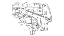 図32〜図36は、別の実施形態に従った動力補助を備えた2ストローク手術用電動切断/結合器具10を例示している。図32〜図36の実施形態は、図25〜図31の実施形態に類似しているが、図32〜図36の実施形態では、発射トリガー20は、下側部分228および上側部分230を含む。両方の部分228、230は、これらの中に配置されたピボットピン207に連結され、このピボットピン207を中心に旋回する。上側部分230は、ギアボックス組立体200の第1の歯車210に係合する歯車部分232を含む。ばね222が、この上側部分230が時計周りの方向に回転するよう付勢されるように、上側部分230に連結される。上側部分230は、発射トリガー20の下側部分228の上面に接触する下側アーム234を含むことができる。このため、上側部分230が時計周りの方向に回転すると、下側部分228も時計周りの方向に回転し、下側部分228が反時計周りの方向に回転すると、上側部分230も反時計周りの方向に回転する。同様に、下側部分228は、上側部分230の下側の肩に係合する回転ストッパー238を含む。この方式では、上側部分230が反時計周りの方向に回転すると、下側部分228も反時計周りの方向に回転し、下側部分228が時計回りの方向に回転すると、上側部分230も時計周りの方向に回転する。  FIGS. 32-36 illustrate a two-stroke surgical powered cutting /