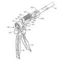 また、この器具は、機械式閉鎖システムを含むことができる。機械式閉鎖システムは、アンビルなどのクランプ部材を備えた細長い溝型部材を含むことができる。クランプ部材は、エンドエフェクタ内に配置された組織をクランプするために溝型部材に旋回可能に連結されている。使用者は、閉鎖トリガーを引いて機械式閉鎖システムを介してエンドエフェクタのクランプ動作を開始することができる。クランプ部材が所定位置にロックされたら、操作者は、別個の発射トリガーを引いて切断動作を開始することができる。これにより、切断器具が溝型部材に沿って長手方向に移動し、エンドエフェクタによってクランプされた組織を切断することができる。 The instrument can also include a mechanical closure system. The mechanical closure system can include an elongated channel member with a clamping member, such as an anvil. The clamp member is pivotally connected to the channel member to clamp tissue disposed within the end effector. The user can pull the closure trigger to initiate the end effector clamping action via the mechanical closure system. Once the clamp member is locked in place, the operator can pull a separate firing trigger to initiate the cutting action. Thereby, the cutting instrument moves in the longitudinal direction along the channel member, and the tissue clamped by the end effector can be cut.