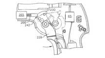 図16は、様々な実施形態に従った別の閉鎖トリガーロック機構を示している。図16の実施形態では、閉鎖トリガー18は、矢印型頭部161を有するウエッジ160を含む。矢印型頭部161は、板ばね162によって下方(すなわち時計回りの方向)に付勢されている。ウエッジ160および板ばね162は、例えば、成型プラスチックから作られることができる。閉鎖トリガー18が引かれると、矢印型頭部161が、ハンドル6のピストルグリップ部分26の開口164内に挿入される。矢印型頭部161の下側の面取り表面166が、開口164の下側の側壁168に係合して、矢印型頭部161が反時計回りの方向に回転させられる。最終的に、下側の面取り表面166が、下側の側壁168を完全に通過して、矢印型頭部161に対する反時計回りの方向の力がかからなくなり、下側の側壁168が、矢印型頭部161の後側のノッチ170のロック位置に滑り込む。  FIG. 16 illustrates another closure trigger locking mechanism according to various embodiments. In the embodiment of FIG. 16, the