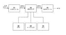 MPEG-2トランスポート・マルチプレックスは、複数のビデオおよびオーディオが供給される、同じ放送チャネルの多重プログラムおよびプライベートデータをサポートする。入力モジュール301は、特定番組にチャンネルをチューニングし、指定されたMPEGストリームをチャンネルから抽出し、かつシステムの他の部分に、MPEGストリームを供給する。アナログのTV信号は、システムの残部が、信号が得られた方法を知らないように、別々のビデオおよび音声エンコーダを使用している同様のMPEGフォーマットにコード化される。情報は、多数の標準手段でアナログのTV信号の垂直帰線消去区間(VBI)に調整することができる。例えば、NABTS(North American Broadcast Teletext Standard) は、FCCがクローズド・キャプション(CC)および拡張されたデータサービス(EDS)に対する或る他のラインの使用を命令する、NTSC信号の、あるライン上へ情報を調整するために、おそらく使用された。このような信号は、入力モジュール301によってデコードされ、かつあたかも信号がMPEG-2プライベートデータ・チャンネルを介して運ばれたかのように、他のモジュールにパスされる。MPEG-2 transport multiplex includes a plurality of video and audio Ruis supplied, supports multiple programs and private data for the same broadcast channel. The