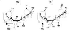 また、図19(a)に示すように、透明部材154の下流端に固定され、透明部材154と一体となって掬い上げガイド156のガイド面に沿って移動する可撓性ガイド部材251を設けた構成においては、原稿の後端が掬い上げガイド156のガイド面に載った状態で原稿MSが停止した場合にも原稿の損傷が起こる。すなわち、透明部材154をホームポジションへ戻すために透明部材154を原稿搬送方向と同方向に移動させると、原稿MSの後端が、可撓性ガイド部材251の原稿搬送方向下流端と当接して、可撓性ガイド部材251とともに原稿MSの後端が掬い上げガイド156ガイド面に沿って原稿搬送方向へ移動する。しかし、原稿MSの先端は、排紙ローラ対92に挟まれており、移動不能となっている。このため、図19(b)に示すように、透明部材154がホームポジションに戻ったとき、原稿の排紙ローラ対92よりも原稿搬送方向上流側の部分が、搬送経路内で折りたたまれ、皺くちゃになり、原稿が損傷してしまう。 Further, as shown in FIG. 19A, a