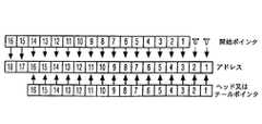 図8では、ボックスの最上部、中間および最下部の行は、開始ポインタ、アドレスおよびヘッドまたはテール・ポインタのビットをそれぞれ表している。より高位に番号付けられているボックスはより上位のビット位置(more significant bit position)を表している。矢印は、それぞれのアドレスのビットが開始ポインタまたはヘッド/テール・ポインタのどのビット位置から得られるかを示している。本展開(derivation)において、太い矢印は定常動作を表している。 In FIG. 8, the top, middle and bottom rows of the box represent the start pointer, address and head or tail pointer bits, respectively. The boxes numbered higher represent the more significant bit positions. The arrows indicate from which bit position of the start pointer or head / tail pointer each address bit is derived. In this derivation, a thick arrow represents a steady operation.