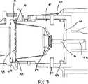 本実施形態によれば、注入ケージは、装置が機械的に閉じられた後にニップ領域に対する閉塞力を増大させるべく加圧されるようになっている。それを行なうため、注入ケージは、ベース19と、移動を制御できる状態でベースに対して軸方向に装着されるピストンユニット20とを備える。図3および図4に示されるように、ピストンユニットは、ベース19に形成される溝22内に嵌まり込む側方リム21を備える。リム/溝アセンブリは、その容積を拡張できる圧力チャンバ23を画成する。チャンバは、リム/溝界面で外側に対してチャンバをシールする弾性ブロックなどのシール手段24によって部分的に占められてもよい。流体は、スタータチャンネルまたはチャンネル25によって内部抽出キャビティからチャンバ内へと運ばれる。これらは、例えば、ピストンユニットとキャビティの上端を形成するベースとが出会うライン26上に形成されてもよい。図示の例において、我々は、キャビティへ向けて広くなる切り欠きを形成し且つピストンユニット20の上側リム上に位置されるスタータチャンネルを有する。これらのスタータチャンネルの少なくとも一部は、ベースの下側リム上に形成することもできる。チャンネルまたはスタータチャンネル25は、径方向に配置されるとともに、キャビティの外周にわたって均一に分布され、それにより、チャンバの加圧を釣り合わせるとともに、ピストンユニットがベースに沿って可能な限り直線的に移動できる。  According to this embodiment, the injection cage is pressurized to increase the closing force on the nip area after the device is mechanically closed. To do so, the injection cage comprises a