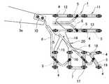 把持具1は、肉厚tが薄い金属製の板材または硬質合成樹脂製の板材からなり、旋回アーム3aの先端部に装着される基部10と、この基部10に延設された把持部11とを備える。把持部11は、基部10から三つの経路に分岐延出した第1〜第3の枝12,13,14と、第3の枝14からさらに分岐延出した第4〜第6の枝15,16,17および第3の枝14の先端部から二股に分岐延出した第7,第8の枝18,19からなる枝群20によって構成されており、各枝12〜19の横断面形状は長方形に設定されている。  The
