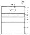 また、p型AlGaInNコンタクト層108の表面にはp電極110が設けられ、p電極110の下部にはリッジストライプ部111の形成箇所を除いて絶縁膜109が設けられている。また、n型GaN基板101の上記の層の積層側と反対側の表面にはn電極112が形成されている。  In addition, a p-