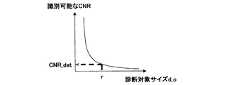 (3)前記コントラストノイズ比算出手段は、前記コントラストノイズ比を、前記診断対象サイズと識別可能なコントライスノイズ比との関係と、前記真陽性率と偽陽性率との関係と、前記識別可能なコントラストノイズ比と偽陽性率との関係とから算出する手段である。 (3) The contrast noise ratio calculating means can identify the contrast noise ratio, the relationship between the diagnostic object size and the distinguishable contrast noise ratio, the relationship between the true positive rate and the false positive rate, and the discrimination This is a means for calculating from the relationship between the contrast noise ratio and the false positive rate.
