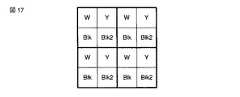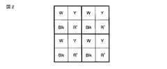 ここでは、フィルタ14として、透明フィルタ14W・黄フィルタ14Y・赤フィルタ14R・赤外フィルタ14Blkの4種類のものが形成される。これらの4種類のフィルタは、有機顔料もしくは染料から選択された色材により形成される。なお、透明フィルタ14W・赤フィルタ14R・黄フィルタ14Y・赤外フィルタ14Blkをそれぞれ1画素とした計4画素により色分離の1単位を形成している。また、透明フィルタ14W・黄フィルタ14Y・赤フィルタ14R・赤外フィルタ14BlkをそれぞれW・Y・R’・Blkとして表記すると、例えば図2に示すような配列状態のフィルタ14が形成される。  Here, four types of filters 14 are formed: a
