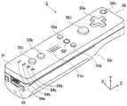 なお、十字キー52aは、上述したプレイヤの方向入力操作に応じて操作信号を出力する操作部であるが、他の態様の操作部でもかまわない。例えば、十字方向に4つのプッシュスイッチを配設し、プレイヤによって押下されたプッシュスイッチに応じて操作信号を出力する操作部を設けてもかまわない。さらに、上記4つのプッシュスイッチとは別に、上記十字方向が交わる位置にセンタスイッチを配設し、4つのプッシュスイッチとセンタスイッチとを複合した操作部を設けてもかまわない。また、ハウジング51正面から突出した傾倒可能なスティック(いわゆる、ジョイスティック)を倒すことによって、傾倒方向に応じて操作信号を出力する操作部を上記十字キー52aの代わりに設けてもかまわない。さらに、水平移動可能な円盤状部材をスライドさせることによって、当該スライド方向に応じた操作信号を出力する操作部を、上記十字キー52aの代わりに設けてもかまわない。また、タッチパッドを、上記十字キー52aの代わりに設けてもかまわない。 Note that the cross key 52a is an operation unit that outputs an operation signal in response to the above-described direction input operation of the player, but may be an operation unit of another mode. For example, four push switches may be provided in the cross direction, and an operation unit that outputs an operation signal according to the push switch pressed by the player may be provided. Further, apart from the four push switches, a center switch may be provided at a position where the cross direction intersects, and an operation unit in which the four push switches and the center switch are combined may be provided. An operation unit that outputs an operation signal in accordance with the tilt direction by tilting a tiltable stick (so-called joystick) protruding from the front of the