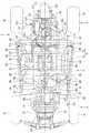 図3に示すように、リヤフレーム部4に支持されたパワーユニットPは、内燃機関13のクランクシャフト16が車体前後方向に向けて配置された縦置きレイアウトとされている。クランクシャフト16から動力が伝達される出力軸80は、略車体中心線CL上に配置され、その前端は、フロントプロペラシャフト83に連結され、後端はリヤプロペラシャフト86に連結されている。  As shown in FIG. 3, the power unit P supported by the rear frame portion 4 has a vertical layout in which the