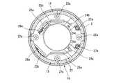 前記ステータ16は、図5に示すように、前記保持部5aの内底壁に4本のビス22aによって固定された円環板状の樹脂ホルダー22と、該樹脂ホルダー22と保持部5aに軸方向から貫通配置されて、各先端面が前記一対のスリップリング48a、48bに摺接して給電される周方向内外2つの給電用ブラシである第1ブラシ23a,23bと、樹脂ホルダー22の内周側に内方へ進退自在に保持されて、円弧状の先端部が前記コミュテータ20の外周面に摺接する通電切換用ブラシである第2ブラシ24a、24bと、から主として構成されている。  As shown in FIG. 5, the