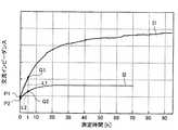 図12は、インピーダンス時間変化曲線上において時刻tでのインピーダンス値の例を示した図である。即ち、インピーダンス時間変化曲線I1については、時刻tにおけるインピーダンス値はA1[Ω]であり、同曲線上の点をQ1で表している。また、インピーダンス時間変化曲線I2については、時刻tにおけるインピーダンス値はA2[Ω]であり、同曲線上の点をQ2で表している。演算部19は、測定により得られた点Qと点Q1又は点Q2を比較し、測定誤差内で点Qが点Q1又は点Q2と一致すればその一致した曲線に相当する水分濃度を検出値とすることができる。  FIG. 12 is a diagram showing an example of the impedance value at time t on the impedance time change curve. That is, for the impedance time change curve I1, the impedance value at time t is A1 [Ω], and the point on the curve is represented by Q1. For the impedance time change curve I2, the impedance value at time t is A2 [Ω], and the point on the curve is represented by Q2. The