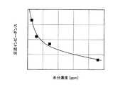 インピーダンス測定回路17は、多孔質電極1に接続され、多孔質電極1に交流電圧を印加することにより多孔質電極1間の交流インピーダンス(即ち、固体電解質膜2の交流インピーダンス)を測定する(インピーダンス測定手段)。そして、インピーダンス測定回路17は、インピーダンスの測定値を演算部19に出力する。図10は、絶縁ガス中の水分濃度(ppm)と固体電解質膜2の交流インピーダンス(Ω)との関係を示したグラフであり、測定結果に基づいて作成されたものである。図10に示すように、交流インピーダンスは水分濃度の増加に対して単調減少している。  The