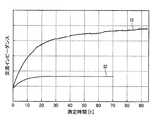 図11は、インピーダンス時間変化曲線の例を示した図である。図11では、大気雰囲気中に置かれていたインピーダンス素子50を所定の水分濃度の絶縁ガス中に置き、交流インピーダンスの時間変化を測定したものである。図中、I1は絶縁ガス中の水分濃度が数十ppmの場合の測定結果を示し、I2は絶縁ガス中の水分濃度が数百ppmの場合の測定結果を示している。記憶装置18は、図11のI1、I2のような曲線を水分濃度毎に予め記憶している。  FIG. 11 is a diagram illustrating an example of an impedance time change curve. In FIG. 11, the