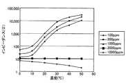 図7は、試験で測定した温度−インピーダンスと水分濃度との関係を示すグラフである。図7では、横軸は温度(℃)、縦軸はインピーダンス(Ω)であり、5つの異なる曲線は、水分濃度が100(ppm)、300(ppm)、1000(ppm)、3000(ppm)、10000(ppm)の場合を表している。マイコン11には、予め試験で測定した、温度情報とインピーダンス情報より水分濃度を得るマトリックスを記憶させおく。図8は、温度とインピーダンスに対して水分濃度を対応させたマトリックスの一例を示す図である。図8は、図7のグラフを離散化したものに相当し、離散化されたインピーダンスと温度とに対して水分濃度が与えられている。3000(ppm)より低い水分濃度に対しては、温度の上昇とともにインピーダンスも増大する。3000(ppm)より高い水分濃度に対しては、温度の上昇とともにインピーダンスは減少する。マイコン11は、測定に基づいて作成された図8のようなマトリックスのデータを予め自身の記憶部に保持している。マイコン11は、ログアンプ7及びアンプ10からインピーダンス情報及び温度情報が得られると、マトリックスデータを参照して、得られた温度情報とインピーダンス情報より水分濃度を検出することができる。  FIG. 7 is a graph showing the relationship between the temperature-impedance measured in the test and the moisture concentration. In FIG. 7, the horizontal axis is temperature (° C.), the vertical axis is impedance (Ω), and five different curves indicate that the moisture concentration is 100 (ppm), 300 (ppm), 1000 (ppm), 3000 (ppm). The case of 10,000 (ppm) is shown. The