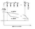 非選択メモリセルMCには、「VUX−VUB」又は「VUX−VUB1」の逆方向バイアスが印加される。この場合、非選択ビット線電圧をVUBの1種類だけにした場合と比べて、ロウ制御回路3から遠い非選択メモリセルMCに印加される逆方向バイアスは「VUB1−VUB」だけ小さくなる。一般的に、逆方向バイアスが「2×VUB」だけ小さくなると非選択メモリセルMCによって生じるオフリーク電流は1桁から2桁程度改善する。  A reverse bias of “VUX-VUB” or “VUX-VUB1” is applied to the unselected memory cells MC. In this case, the reverse bias applied to the unselected memory cell MC far from the