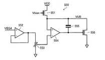 図示しない第2の非選択ビット線電圧VUB1を生成する回路についても、オペアンプ552の非反転入力端子(+)に入力される基準電圧VBG4を適切に変えることで、第2の非選択ビット線電圧VUB1を生成する回路を構成することができる。  Also for a circuit that generates the second unselected bit line voltage VUB1 (not shown), the second unselected bit line voltage can be changed by appropriately changing the reference voltage VBG4 input to the non-inverting input terminal (+) of the