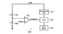 消去電圧生成回路530は、選択ビット線BLに供給する消去電圧VWRを生成する回路である。消去電圧生成回路530は、チャージポンプ531、VCO(電圧制御発振器)532、VCOバイアス回路533、オペアンプ534、可変抵抗器535及び536を備える。チャージポンプ531は、供給電圧を昇圧し、消去電圧VWRを生成する。この消去電圧VWRは、直列接続された可変抵抗器535及び536で分圧された上で、オペアンプ534の非反転入力端子(+)に入力される。オペアンプ534は、このオペアンプ534の反転入力端子(−)に入力される基準電圧VBG3と、消去電圧VWRを分圧した電圧とを比較し、消去電圧VWRに応じたフィードバック信号を生成する。VCO532は、VCOバイアス回路533から供給されるバイアス電圧で駆動し、オペアンプ534から与えられるフィードバック信号に基づいてチャージポンプ531を活性化させる。以上から、基準電圧VBG3から消去電圧VWRを安定的に生成することができる。  The erase