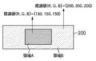 図2は、メモリ部100に格納される固定パターンの画像データの一例を示す図である。固定パターンの画像データ200は、後述する”スクロールパターン”および”サンプル画像”の基準となる基準パターン画像である。ここでは説明を簡潔にするために、固定パターンの画像データ200は矩形の画像データであり、2つの異なる階調値を有する領域(領域Aおよび領域B)により構成されるものとして説明する。具体的には、領域Aは、(R,G,B)=(150,150,150)の濃い(暗い)グレーであり、領域Bは、(R,G,B)=(200,200,200)の薄い(明るい)グレーであるとする。なお、赤(R)、緑(G)、青(B)各色は256(8ビット)階調で表されるものとしている。なお、使用環境の違い等で生じる応答速度の変化量が特に大きい階調の組み合わせを固定パターンに含まれる2種類の階調として選択するとよい。  FIG. 2 is a diagram illustrating an example of fixed pattern image data stored in the