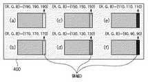 具体的に設定する領域Dの階調値は、どのようなものであってもよいが、使用温度や使用時間などの使用環境から液晶の応答特性の変化度合いをおおよそ予測し、その変化量によって決定する色付き度合いをよく表わす階調値をいくつか設定すればよい。また、領域A、及び領域Bの階調値に近い階調値をいくつか選択し、領域Dにそれぞれ設定してもよい。ここでは一例として、領域Dを、(R,G,B)=(190,190,190)から(R,G,B)=(90,90,90)まで、(R,G,B)=(20,20,20)毎に変化させた互いに異なる6個のグレー画像に置換する。領域Dの階調値を変更する目的は、領域Cを有するスクロールパターン300と類似した画像の候補を、複数の静止パターンとして固定表示することにある。  The gradation value of the region D to be specifically set may be any value, but the degree of change in the response characteristic of the liquid crystal is roughly estimated from the usage environment such as the usage temperature and usage time, and the amount of change It is only necessary to set several gradation values that well represent the degree of coloring to be determined. Further, some gradation values close to the gradation values of the regions A and B may be selected and set in the region D, respectively. Here, as an example, the region D is changed from (R, G, B) = (190, 190, 190) to (R, G, B) = (90, 90, 90), (R, G, B) = Replace with six different gray images which are changed every (20, 20, 20). The purpose of changing the gradation value of the region D is to fix and display image candidates similar to the