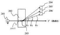 図2において、光源201から発せられた光は、測定対象物203が分注された反応容器202に入射される。反応容器202内で入射した光は測定対象物203に衝突し散乱される。散乱した光は、図2の例では、透過光とθ1の角度をなす位置に検出器(検出素子)204が配置され、透過光とθ2の角度をなす位置に検出器(検出素子)205が配置される。また、透過光とθ3の角度をなす位置に検出器(検出素子)206が配置されている。  In FIG. 2, the light emitted from the
