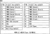 さらに、SDA信号が伝送される信号線は、ピン番号が16であるピンに接続され、SCL信号が伝送される信号線は、ピン番号が15であるピンに接続される。また、SDA信号が伝送される信号線、およびSCL信号が伝送される信号線は、タイプAにおける場合と同様に、差動信号を伝送することができるように差動ツイストペア結線されてシールドされ、ピン番号が13番のピンに接続されるグランド線に接地されている。さらに、また、新たな電子機器の接続を検出するための信号が伝送される信号線86は、ピン番号が19であるピンに接続される。  Further, a signal line for transmitting the SDA signal is connected to a pin having a pin number of 16, and a signal line for transmitting an SCL signal is connected to a pin having a pin number of 15. Also, the signal line for transmitting the SDA signal and the signal line for transmitting the SCL signal are shielded by differential twisted pair connection so that a differential signal can be transmitted as in the case of Type A. The pin number is grounded to a ground line connected to the 13th pin. Furthermore, a
