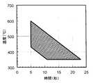 本発明のリフロー処理条件(温度と時間)を表した図1において、リフロー処理条件は斜線の範囲で示される。ここで、Tは加熱温度(℃)、tは加熱時間(秒)を表す。