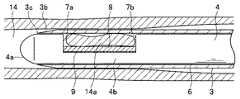 次いで、処置具本体2の挿入部4と、この挿入部4に外装されている可撓性シース3とを、体内14内に挿通する。その際、図2に示すように、可撓性シース3の先端外表面3bが、挿入部4の先端面4aに対して接線方向に連続された状態にあるため、この先端面4aと先端エッジ3cとの境界に段差が生じることがなく、挿入に際して体内14の内壁を擦過してしまうことはない。又、図3に示すように、先端面4a内に集積回路素子11をインサート成形しているため、先端部が硬くなり、先端面4aによる体内14内のガイド性が向上し、更に、先端面4aの材質は何ら変更する必要がないため製造が容易となる。  Next, the