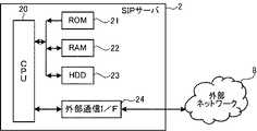 図3を参照して、SIPサーバ2の電気的構成について説明する。SIPサーバ2は、SIPサーバ2の制御を司るCPU20を備える。CPU20には、ROM21、RAM22、HDD23、外部通信I/F24が接続されている。ROM21は、SIPサーバ2を動作させるためのプログラムおよび初期値等を記憶している。RAM22は、制御プログラムで使用される各種の情報を一時的に記憶する。HDD23は、各種の情報を記憶する不揮発性の記憶装置である。外部通信I/F24は、SIPサーバ2を外部ネットワーク8に接続する。The electrical configuration of the