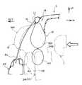 図示は省略するが、カーテンエアバッグ12は、例えばロール折り又は蛇腹折りされて長尺状に折り畳まれた上で、フロントピラー(Aピラー)16からルーフサイド部18に亘ってリヤピラー19の近傍まで収納されており、後述する所定の場合に図1に示される如く前後のサイドウインドガラス14、センタピラー15に沿って展開して前席、後席の乗員の頭部を保護するようになっている。なお、この実施形態におけるルーフサイド部18は、該ルーフサイド部18とフロントピラー16とセンタピラー15とリヤピラー19とで囲まれた乗降用の開口部としての前後のドアオープニング11、13の上縁を成している。カーテンエアバッグ12は、ルーフサイド部18を成すルーフサイドレールとルーフヘッドライニングとの間に収容されている。なお、図3、図4では、カーテンエアバッグ12(後述する前側副チャンバ42)がフロントピラー16とピラーガーニッシュ17との間から展開されている状態を示している。  Although not shown, the