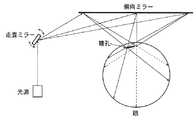 瞳ズレの対策として、偏向ミラーに複数の偏向焦点を持たせる方法がある(例えば、特許文献2参照)。図25のように、偏向ミラーが2つの偏向焦点を有していると、瞳孔が左に移動しても、別の偏向焦点が瞳孔内となるために、瞳ズレを避けられる場合がある。 As a countermeasure against pupil misalignment, there is a method in which a deflection mirror has a plurality of deflection focal points (see, for example, Patent Document 2). As shown in FIG. 25, when the deflection mirror has two deflection focal points, even if the pupil moves to the left, another deflection focal point is in the pupil, and thus pupil misalignment may be avoided.