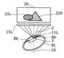 このような構成とすることにより、瞳の位置を両眼の眼球の表面からの反射光強度などから検出して、両眼のうちのどちらの眼で観察しているか、あるいは両眼で観察しているかを判定し、その情報をもとに出射光の光量の増減を制御して適正な明るさの映像を観察者に観察させることができる。 By adopting such a configuration, the position of the pupil is detected from the intensity of reflected light from the surface of the eyeballs of both eyes, and it is observed with either eye or with both eyes. It is possible to make the observer observe an image with appropriate brightness by controlling increase / decrease in the amount of emitted light based on the information.