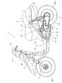 ダウンチューブ6の後端で、メインパイプ7の立ち上がり部には、ブラケット15が突設されている。ブラケット15には、スイングユニット2のハンガーブラケット18がリンク部材16を介して揺動自在に支持されている。  At the rear end of the