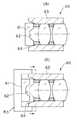 ところで、図4(A)、図4(B)に示す対物レンズユニット60は、(第1)対物レンズ61の外形中心が、その内面(裏面)側のR面62中心と一致するように芯取り形成されると共に、表裏面が側面に対して垂直に形成された対物レンズ61が、対物レンズ枠63の先端部内径に形成されたテーパ部64に当接した位置にて対物レンズ平行出し治具65を用いて接着固定されている。  By the way, the