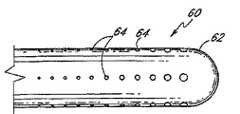 カテーテル60のチューブ62は各種の材料で作ることが可能であり、解剖システムに対する非反応性、可撓性、軽量、強度、滑らかさ、および安全性などの目的に適切な配慮をすればよい。好適な材料としては、ナイロン、ポリイミド、テフロン(登録商標)その他当業者には既知の材料があげられる。注液部の長さには制限はないが、約0.5〜20インチの長さであることが好ましく、約10インチ以上の長さであればより好ましい。出口孔64の直径は、注液部の近位端での約0.0002インチから、その遠位端での約0.01インチまでの範囲となっていることが好ましい。最大の、すなわち最も遠位にある出口孔64は、チューブ62の遠位端から約0.25インチのところにあることが好ましい。隣接する孔64の軸方向での間隔は、約0.125〜0.25インチの範囲にあることが好ましいが、約3/16インチであればさらに好ましい。図5における実施形態と同様にして、隣接する孔が約120度の角度をとって配置されるように孔64を設けることにしてもよい。当然のことながら、出口孔64をあまりにも多く設けると、チューブ62の強度が低下するので好ましくない。The