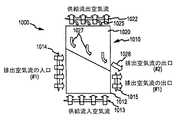 図4中の400で示される熱交換器の構造は、発明者によって実験室で形成され、図5に示されるようにモデリングされた。フロー/ハウジングの設計に関する他の選択肢は、図10の冷却器1000および図11の冷却器1100を用いる構造で示される。冷却器1000は、第1部分または端部1012および第2部分または端部1020を備えるハウジング1010を有するものとして示される。第1部分1012は、供給流入空気流1013および入力排出空気流1014を受け取るための入口またはベントを備えて構成され、また第1部分1012は、ユニット1000から排出空気流1015を出力するためのベントまたは出口も含む。第2部分1020は、供給流出空気流1022のための出口(例えば、多岐管および空気流を導くための他の構成要素を伴って)を備えて構成され、この供給流出空気流は、供給流入空気流1013(チャネルの他のまたは開始部分における直交流として提供される排出空気流1014を伴って)のために提供されるチャネルの一部分に対して逆流を提供するために、矢印1027で示されるようにハウジング1010中へと再び導かれる部分1025を有し、この空気はその後1028で、ハウジング部分1020から排出される。入力排出空気流1014は、排出された空気または外気へと戻されてもよい(例えば、建物の場所から)。この流入路1000は、より少ないパージ空気1025、1027を利用することによって効率性を改良し、とりわけ、所望の効率性を増大または維持するためにパージ空気を制限することに好適である。  The heat exchanger structure shown at 400 in FIG. 4 was formed in the laboratory by the inventor and modeled as shown in FIG. Another option for the flow / housing design is shown in the configuration using the cooler 1000 of FIG. 10 and the cooler 1100 of FIG. The cooler 1000 is shown as having a housing 1010 that includes a first portion or