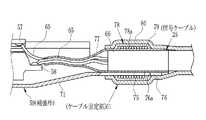 また、接合片75を含む糸巻78及び接着剤79を覆うように、可撓性の保護チューブ80が被覆される。この保護チューブ80でケーブル固定部61が被覆されることにより、接合片75及び糸巻78・接着剤79で補強枠59に一体的に固定される信号ケーブル25が、湾曲部32の曲げ操作により曲げられる場合に、曲げ力を信号ケーブル25だけでなく保護チューブ80にも分散させることができ、その分だけ信号ケーブル25の曲げによる耐性を向上させることができる。  In addition, a flexible