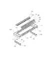 また、前記第2突出端部122には、補強金具としての第2補強金具151が取付けられる。該第2補強金具151は、第2突出端部122に形成された第2金具保持凹部126内に収容されて保持される。なお、該第2金具保持凹部126は、第2突出端部122の幅方向両端において上下方向に延在するように形成された接続腕収容溝部126aと、第2突出端部122の幅方向中間部分において上下方向に延在するように形成された保持突起収容孔(こう)部126bとを備える。  Further, a second reinforcing metal fitting 151 as a reinforcing metal fitting is attached to the second