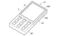 図3は、図1に示したタッチパネル装置1が適用される携帯情報端末を示す斜視図である。この携帯情報端末21では、パネル本体3が、タッチ面2を開放させた状態で筐体22内に収容されている。パネル本体3の背面側には、液晶ディスプレイなどの表示装置23が配置されている。パネル本体3の各部材は透明材料で構成されており、表示装置23の表示画面をパネル本体3を通して見ることができる。  FIG. 3 is a perspective view showing a portable information terminal to which the touch panel device 1 shown in FIG. 1 is applied. In the