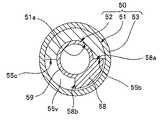 コイルシース71の外周面側は、挿入部を構成する被覆管73によって覆われている。被覆管73は、電気的な絶縁性を有するとともに、柔軟性を有する樹脂製である。管先端73aの内孔には管状の回動規制部材74が固設されている。回動規制部材74の先端部には、図20に示すように内周面から中心方向に向かって突出した一対の回動規制凸部74aが、対向した位置関係で備えられている。それぞれの回動規制凸部74aには第1規制面74bと第2規制面74cとが備えられている。  The outer peripheral surface side of the