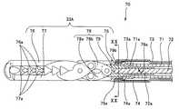 コイルシース71及び操作ワイヤ72は、操作部の回転操作に伴って捩れが生じ、該操作部の回転操作が術者によって続行されることにより、該コイルシース71及び操作ワイヤ72に徐々に捩り力が蓄積されていく。そして、コイルシース71及び操作ワイヤ72に蓄積されていく捩り力が所定量を超えると、該コイルシース71及び操作ワイヤ72に蓄積された捩り力が一気に開放される。このことによって、手元側の回転操作がコイルシース71及び操作ワイヤ72の先端まで伝達されて、先端カバー75が回転すると共に、処置部33Aが回転される。  The