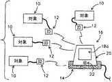図1には、本発明の好ましい一実施形態によるシステムを示す。図1は、関心のある対象10に物理的に関連した識別装置12を示している。図1はまた、情報供給装置14及び観察装置16も示している。観察装置16は無線検出ユニット20、ディスプレイ18、及びユーザ入力装置22を有している。  FIG. 1 shows a system according to a preferred embodiment of the present invention. FIG. 1 shows an