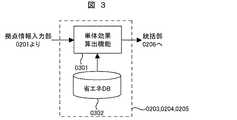 図3は、単体効果算出部0203,0204,0205の機能ブロック図である。処理内容は0203,0204,0205で同様である。0301は単体効果算出機能で、省エネ対策別の省エネ効果を算出しこれを統括部0206へ伝送する機能である。0302は省エネDBで、単体効果算出機能0301が省エネ効果を算出するための各種データが格納されている。  FIG. 3 is a functional block diagram of the single