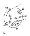 第1入口ポート31aとオリフィス31bを通って入る流体は、上記の様に、第2回転子溝42、固定子溝39、第3回転子溝43を介して弁を通過し、第1出口オリフィス34bとポート34aを介して弁を出て、器具の主作動構成要素に入る。これにより、流れを器具の主作動構成要素に提供することができるのと同時に、これらの溝が洗浄されるようになっている。しかしながら、先に述べた様に、溝39を、第2溝42の端部位置にあるか又は終端であってもそこにある廃棄出口に換えることができる。しかしながら、これらの場合、システムの主作動構成要素を通る流れを利用することはできない。  As described above, the fluid entering through the