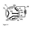 更に、固定子の入口/出口ポートは、穴(又はあらゆる型式のチャネル)を介して、内側固定子面11a上のオリフィスに接続されているので、ポートとオリフィスの間に非線形チャネルを作ることにより、ポートを、内側固定子面11a上のオリフィスのパターンとは異なる様式に配置することもできる。固定子へのポートは、固定子の、前側以外の外側面に配置することもできる。しかしながら、単純化のために、図6に関連して後で説明する様に、図では、ポートは、内側固定子面のオリフィスと一直線になるように配置されている。  In addition, the stator inlet / outlet port is connected to the orifice on the