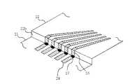 図14に示すように、画像表示素子は、ガラス板等からなる前面パネル21と、同じくガラス板等からなり前面パネル21に対向する裏面パネル22と、両パネル間にマトリクス状に配置されて表示又は非表示の状態が選択される複数の画素(図示なし)と、この画素を制御する複数の電極(図示なし)とを有し、両パネル21、22が画素及び電極を挟んで貼り合わされて構成されている。