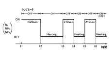 時間t1から時間t2の間(例えば、520sec)は処理ガスが導入(ON)され、ランプヒータがOFFにされ、前駆体NHxFyが自然酸化膜SiO2と反応する処理が実施される(図4(a)(b)、図11(a)(b)参照)。時間t2から時間t3の間は処理ガスが停止(OFF)され、ランプヒータがONにされ、化合物である(NH4)2SiF6が分解して昇華され自然酸化膜SiO2がエッチングされる(図4(c)(d)、図11(c)参照)。Between time t1 and time t2 (for example, 520 sec), the processing gas is introduced (ON), the lamp heater is turned off, and the process in which the precursor NHxFy reacts with the natural oxide film SiO2 is performed (FIG. 4 ( a) (b), see FIG. 11 (a) (b)). From time t2 to time t3, the processing gas is stopped (OFF), the lamp heater is turned on, the compound (NH4 )2 SiF6 is decomposed and sublimated, and the natural oxide film SiO2 is etched ( 4 (c) (d) and FIG. 11 (c)).